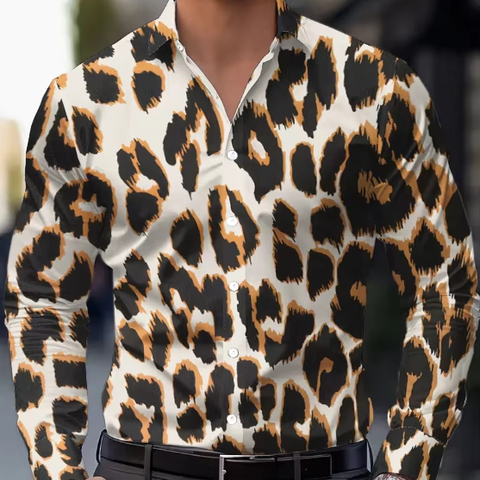 Camisa de satén de manga larga para hombre, estampado de leopardo, abotonada, estilo salvaje, patrón de animales, transpirable para fiesta, noche, servicio callejero